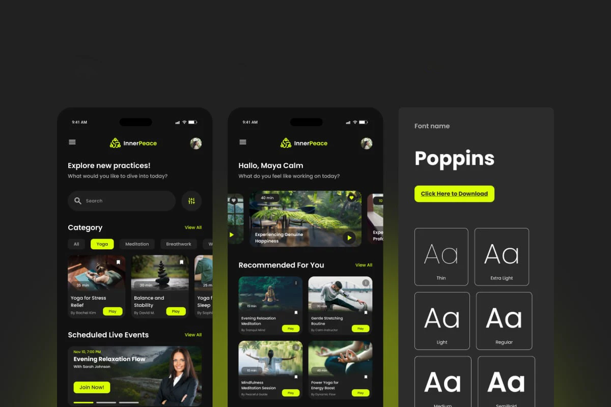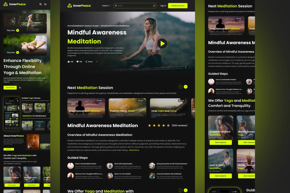 InnerPeace was built to be more than a meditation app — it’s a sanctuary in your pocket. With a soft visual rhythm, warm tones, and human-centered interactions, we created an experience that lowers cognitive load and raises emotional clarity. Every gesture, tone, and pixel is designed to foster stillness, focus, and mindful presence.